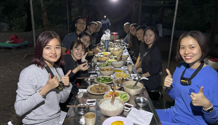 Ai cũng mệt nhừ, ướt nhẹp cả người lại nghe được chuẩn bị một phòng xông hơi khiến ai cũng thấy “sướng”, năm chị em trong đoàn liền chui ngay vào phòng để làm ấm người. Đúng 6h chiều là chúng mình ngồi vào bàn ăn tối, bữa ăn phục vụ cho 10 người được các anh sắp xếp chuẩn bị vô cùng chu đáo. Đồ ăn gồm các món chay như đậu hũ sốt cà, trứng chiên, khoai tây chiên, rau củ luộc và canh bí xanh dành cho bốn bạn tây người Đức ăn chay. Team người Việt chúng mình thì ăn bình thường gồm các món canh khoai tây cà rốt thịt bò, thịt heo xào (có tí muối ớt+lá chanh), thịt gà chiên bột, khoai tây chiên giòn (không phải lấy từ oishi), một đĩa cải xào, đĩa rau luộc, canh bí xanh, món tráng miệng bữa tối này là xoài. Một bàn ăn thịnh soạn đầy đủ chất như thế này còn nằm sâu trong rừng, cạnh hang nữa khiến khung cảnh ăn tối trở nên đặc biệt hơn bao giờ hết. Không phải vì đói mới khen ngon mà quả thực các anh đầu bếp ở đây làm món nào cũng đều cực kì vừa miệng. Thịt heo được ướp rất kĩ, thịt ngon ngọt làm ban đầu mình cứ tưởng đây là thịt heo rừng nữa cơ. Bàn đầy đồ ăn vậy mà ba đứa con gái ăn gần hết phần của hướng dẫn viên luôn. Như được chia sẻ lại thì trước đây các anh đầu bếp đều ăn chung cho thắt chặt tình đoàn kết tuy nhiên một số khách lại phản ánh hơi mặn quá, cay quá thế là các anh tách ra ăn riêng.