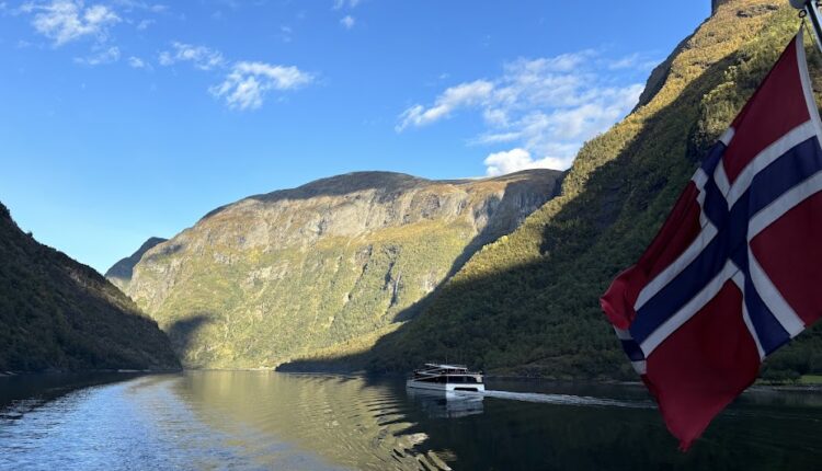 Ngày đầu tiên của chuyến hành trình tại Na Uy, điểm tham quan đầu tiên là Gudvangen- Vịnh hẹp dài đẹp nhất Thế Giới đã được UNESCO công nhận là Di sản thế giới vào 2005. 16h30, chiếc du thuyền The Fjords bắt đầu đưa đoàn mình tham quan đi xuyên vịnh hẹp này trong khoảng thời gian gần 100 phút. Các khung cảnh từ từ dần hiện lên rõ nét và chân thực nhất về cảnh quan, khí hậu, đất trời vùng Bắc Âu. Những ngọn núi cao sừng sững hai bên đường, khung cảnh các ngôi làng yên bình nằm đan xen giữa lòng vịnh hẹp, ở phía xa trên đỉnh núi là những dòng thác không ngừng tuôn chảy, ở một vài nơi, cây lá đã dần ngả vàng, sắc thu ở khu vực Bắc Âu đẹp nhẹ nhàng thật sự. Thời tiết lúc đó khá gió, nhiệt độ loanh quanh khoảng 8 đến 10 độ C, trên các dãy núi cao kia là các hồ nước mênh mông chưa bị băng bao phủ nên có thể thấy những dòng thác chảy từ đằng xa, xuyên qua lớp mây mù rơi xuống dưới, mọi người cười nói với nhau nhìn cứ như nước trên thiên đàng chảy xuống vậy.